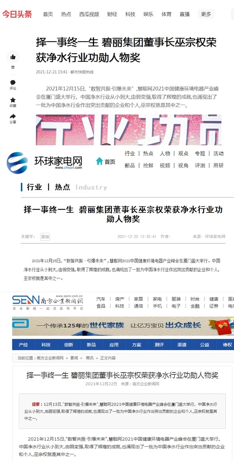 搜狐網(wǎng)、今日頭條、騰訊新聞、南方企業(yè)新聞網(wǎng)、中華網(wǎng)快訊、現(xiàn)代家電網(wǎng)等平臺(tái)深度報(bào)道了碧麗創(chuàng)始人巫宗權(quán)先生在凈水路上的心路歷程,其不為繁華易匠心的高尚品質(zhì)值得被贊頌。
