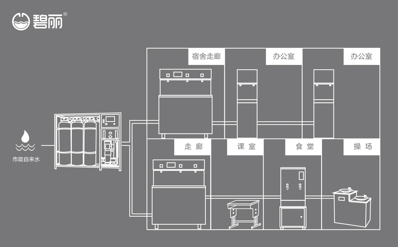 碧麗大型反滲透純水設(shè)備將自來(lái)水集中處理后,把優(yōu)質(zhì)的純凈水通過(guò)專(zhuān)用的供水管道輸送到各飲水點(diǎn);