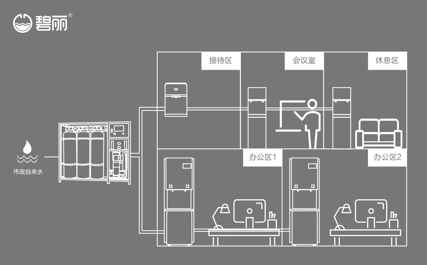 碧麗商用反滲透純水機(jī)將自來(lái)水集中處理后,把優(yōu)質(zhì)的純凈水通過(guò)專用的供水管道輸送到各飲水點(diǎn);